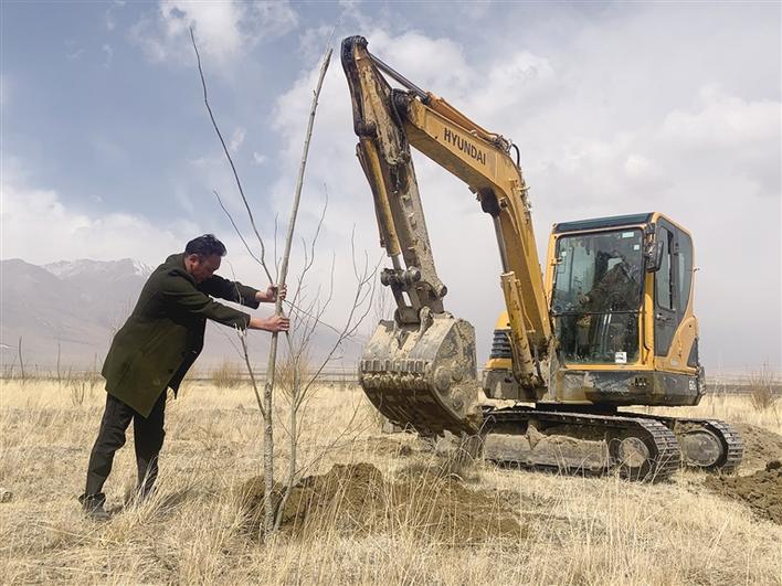死了那么多樹,為什么還在堅持?“那幾年,在這里隨手捧起一把黃土,還會沙化。我必須堅持下來。”索朗羅布說。2015年春天,索朗羅布再次貸款40余萬元購買了一臺挖掘機(jī),準(zhǔn)備修建水渠和挖坑。同年3月,索朗羅布又一次獨自種樹苗,母親卓瑪央金心疼壞了,于是帶著村里姐妹們前來幫忙。不僅如此,她們還帶來了防止草原鼠啃食樹根的土方法,用塑料瓶圍著樹根包一圈,既能防止草原鼠搞破壞,還能節(jié)省成本。