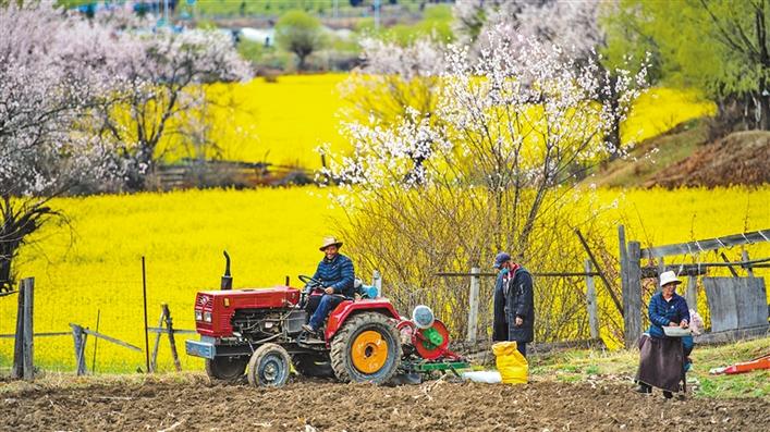 日前,林芝市巴宜區(qū)布久鄉(xiāng)朵當(dāng)村群眾駕駛農(nóng)用機(jī)械犁地,與遠(yuǎn)處桃花和油菜花構(gòu)成一幅秀美田園風(fēng)光圖。