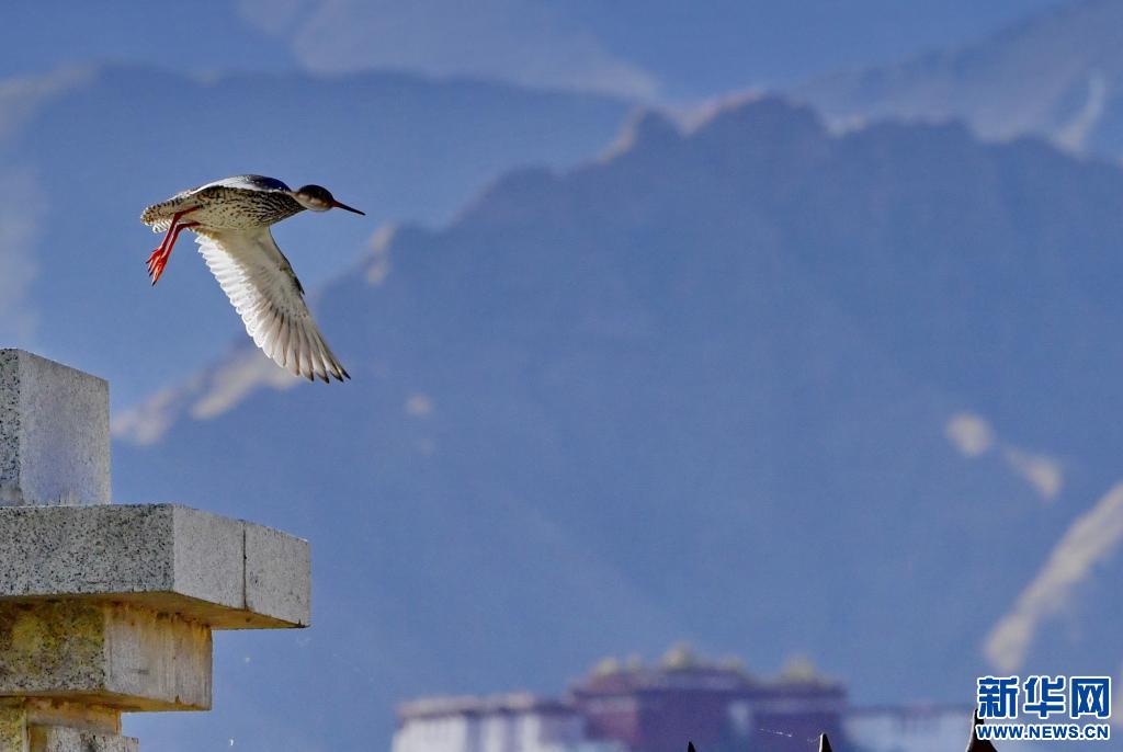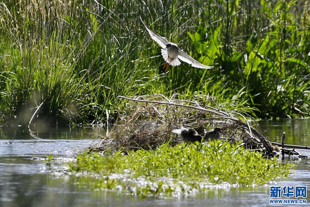 初夏,紅腳鷸在位于西藏拉薩的拉魯濕地國家級自然保護(hù)區(qū)內(nèi)起舞覓食。
