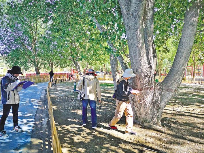 圖為西藏農(nóng)牧學(xué)院的師生在測(cè)算貢覺(jué)林卡內(nèi)古樹(shù)的相關(guān)數(shù)據(jù)。記者 扎西頓珠 攝