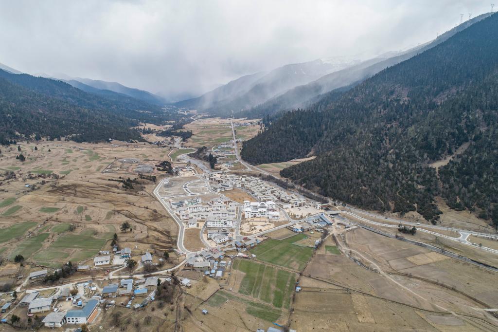 這是川藏公路旁的魯朗國(guó)際旅游小鎮(zhèn)風(fēng)光(4月2日攝,無(wú)人機(jī)照片)。新華社記者 孫非 攝