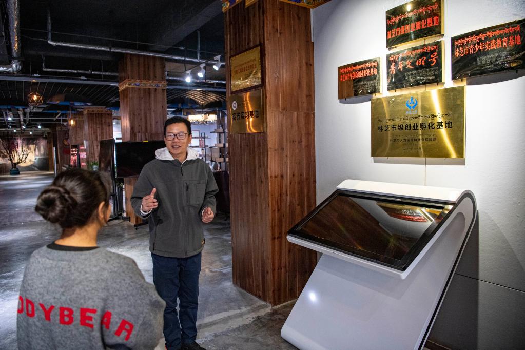 在林芝逐夢(mèng)眾創(chuàng)產(chǎn)業(yè)園,陸錦華正在向?qū)嵙?xí)生介紹情況(4月2日攝)。新華社記者 孫非 攝