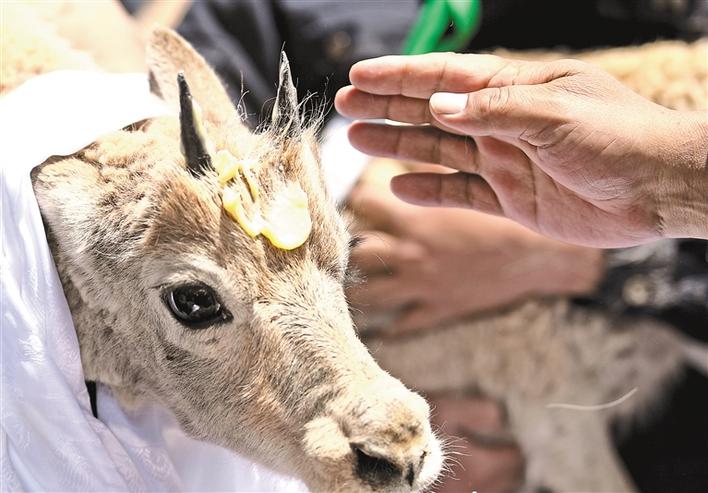 7月7日,在可可西里索南達(dá)杰保護站野生動物救助中心,三公兩母共五只人工救助的藏羚羊被放歸大自然。圖為7月7日,在可可西里索南達(dá)杰保護站野生動物救助中心,可可西里巡山隊員按照風(fēng)俗,在藏羚羊額頭上涂抹酥油表達(dá)祝福。[詳細(xì)]