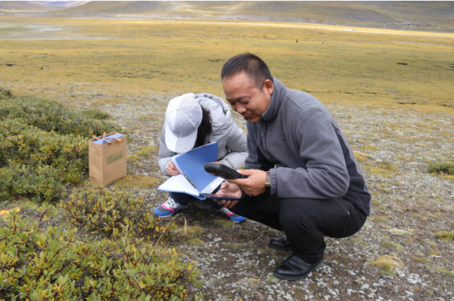 郝偉(右)和團(tuán)隊(duì)工作人員在野外采集植物樣本數(shù)據(jù)。受訪者供圖