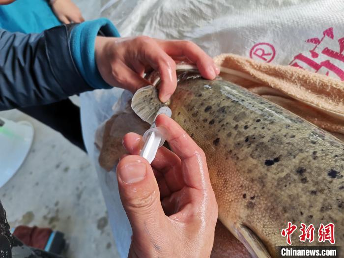 圖為多布水電站增殖放流站工作人員為魚進行人工催產(chǎn)。