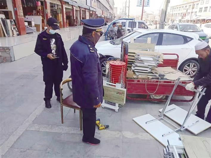 執(zhí)法人員對(duì)占道經(jīng)營(yíng)商戶(hù)進(jìn)行勸說(shuō)。圖由城關(guān)區(qū)城管局提供