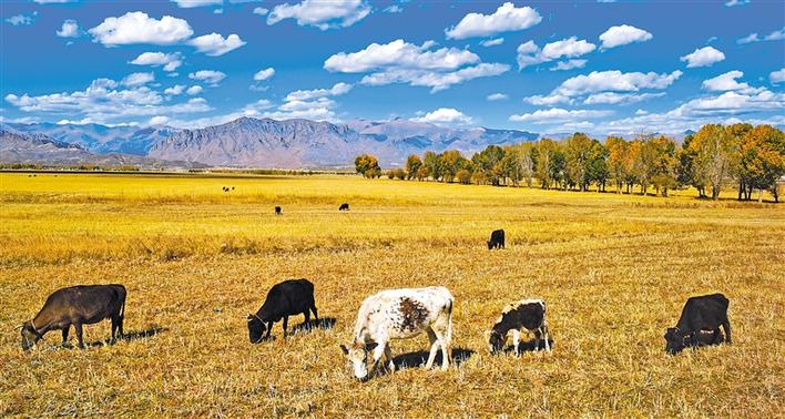 秋日的雪域高原魅力無限,藍天、白云、黃葉、碧水、雪山及金色草原交相輝映,宛如一幅幅色彩繽紛的優(yōu)美畫卷。