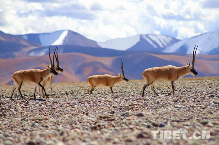 圖為那曲市境內(nèi)雪山下正在遷徙的藏羚羊 攝影:王魯鎮(zhèn)