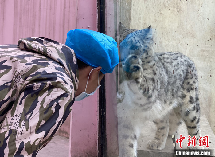 11月5日,史壽軍隔著玻璃與雪豹互動(dòng)。 中新社記者 李江寧 攝
