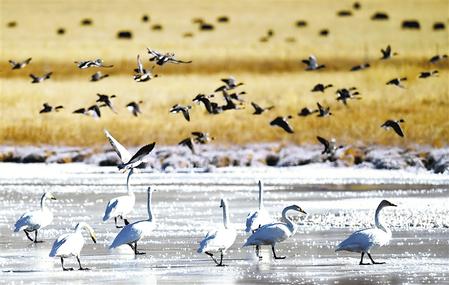 越冬的大天鵝和眾多候鳥在尕海濕地浴雪歡歌,翩翩起舞。