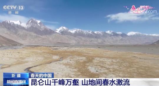 立春后,新疆境內(nèi)的昆侖山山色黑白相交,更加雄渾有力,藍(lán)天、白云、雪山構(gòu)成了一幅壯美的畫(huà)卷。和高山的積雪不同,山下的冰河融化、春水激流,野生牦牛等動(dòng)物聚集在河邊暢飲、吃草,彰顯出春天的勃勃生機(jī)。