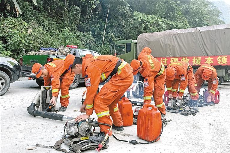 圖為在重特大森林火災長途機動滅火增援實戰(zhàn)演練過程中,消防救援人員對裝備進行檢查維修。圖片由昌都市森林消防支隊提供