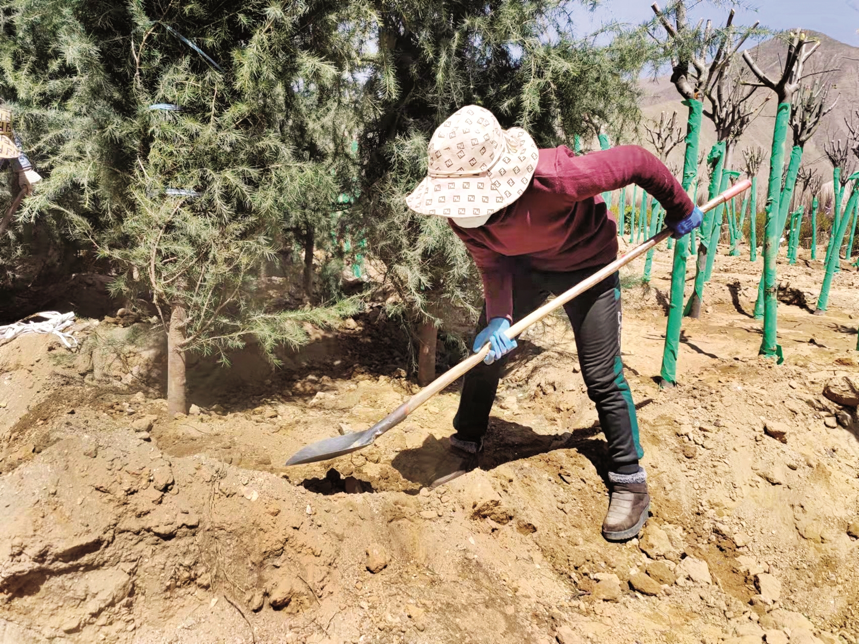 當前拉薩天氣晴好,氣溫回升,正是育苗植樹的好時節(jié)。扶正樹苗、填土壓實……在拉薩市曲水縣茶巴朗村水土保持生態(tài)園里,縣水利局組織附近村民移植培育松樹、蘋果樹、桃樹等林木,大家三五成群忙得不亦樂乎。