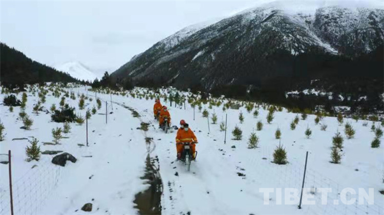 圖為卓瑪朗措國(guó)家濕地公園濕地檢測(cè)員冒著風(fēng)雪巡邏
