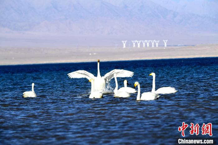 圖為天鵝群在湖中展翅?!〈饔婪?攝