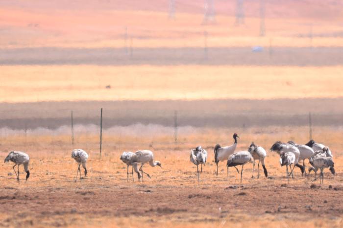 4月24日,在青海湖北岸的青海省海北藏族自治州剛察縣,攝影愛好者在該縣哈爾蓋鎮(zhèn)田間拍攝到成群黑頸鶴。黑頸鶴是全球十五種鶴類中唯一在高原繁殖和棲息的鶴類。[詳細]