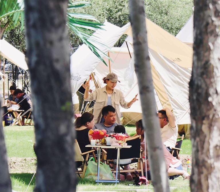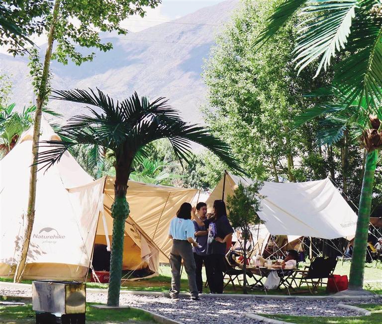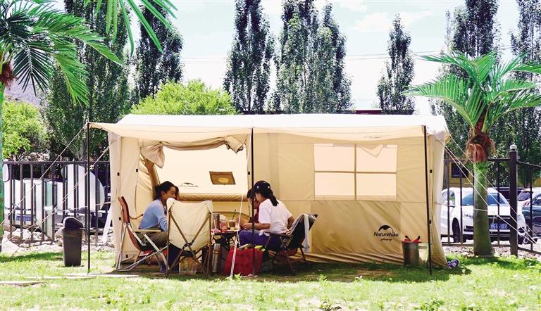 在拉薩,還未踏進(jìn)林卡營(yíng)地,便能聞到烤肉的香氣,尋著歡笑聲走去,你會(huì)發(fā)現(xiàn),這些林卡營(yíng)地宛如“桃花源”呈現(xiàn)在眼前。不論是藏式林卡營(yíng)地還是西式露營(yíng)地,都有共同的“魔力”——把“煩惱”擋在門外。一頂頂白色的帳篷和天上的朵朵白云相呼應(yīng),綠色的草地是夏天才有的限定“地毯”,抬頭,油綠而繁茂的樹葉在微風(fēng)中婆娑,似乎在回應(yīng)著樹下人群的歡笑。讓人不禁感嘆,原來(lái),大自然才是治愈內(nèi)心最好的良藥。