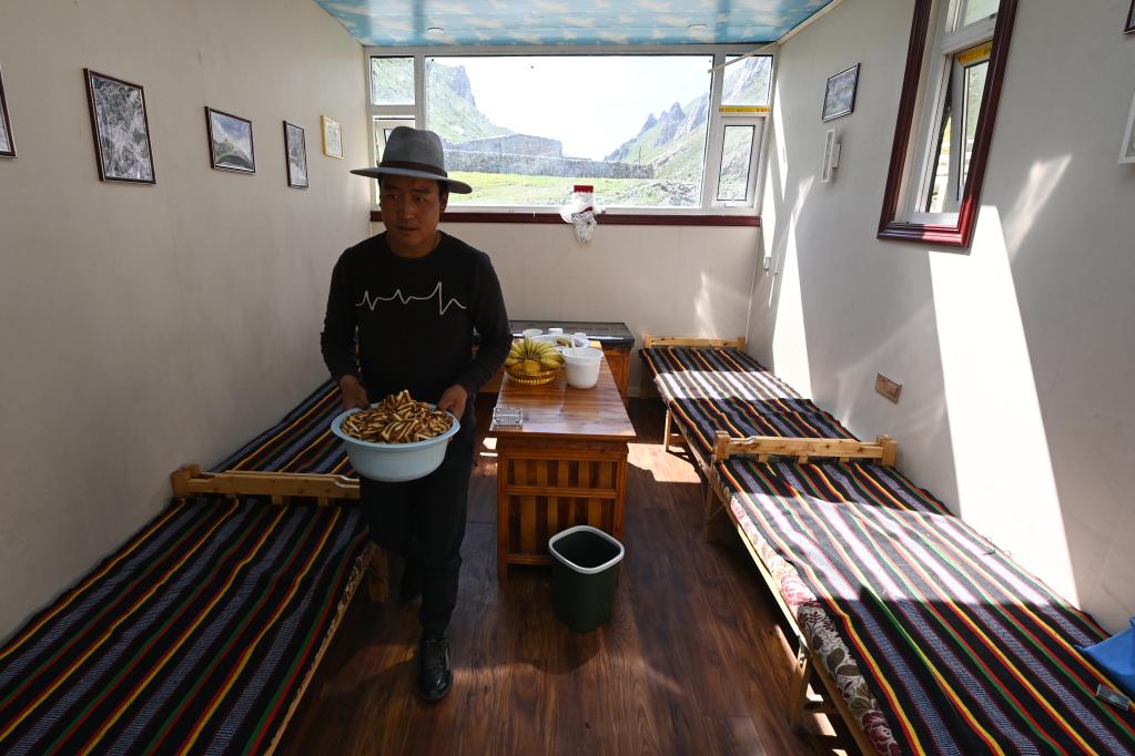 盛夏,昂賽大峽谷流水潺潺、綠草如茵;四周山勢(shì)奇絕,常有雪豹、白唇鹿、巖羊等野生動(dòng)物出沒(méi)。在特許經(jīng)營(yíng)接待集裝箱內(nèi),桑周忙著打掃衛(wèi)生,清洗床鋪,準(zhǔn)備迎接從各地到來(lái)的自然體驗(yàn)者。
