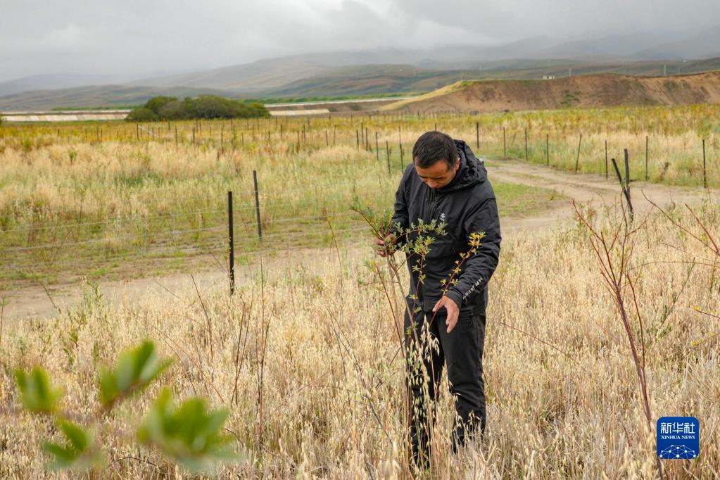 瑪曲縣自然資源局高級工程師馬建云在黃河瑪曲段干流沿岸一處阻沙林帶建設區(qū)域觀察植被生長情況(9月16日攝)。新華社記者 郎兵兵 攝