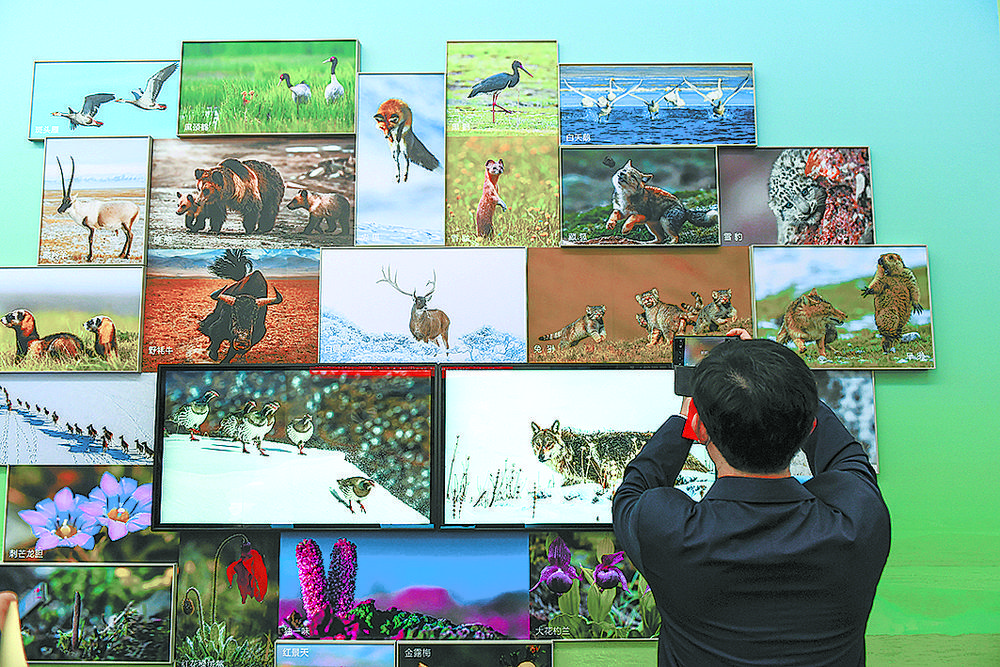 雪豹、兔猻、黑頸鶴、馬麝、廣布紅門蘭、水母雪兔子、紅花綠絨蒿……青海特有的動(dòng)植物照片墻吸引觀眾駐足,珍稀動(dòng)物的生活智慧和罕見植物的生長(zhǎng)歷程通過攝影師的鏡頭,向世界展示了青海生物多樣性保護(hù)取得的顯著成就。