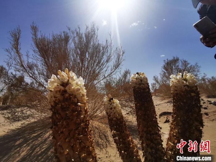 2020年5月16日,甘肅酒泉市金塔縣境內(nèi)沙漠里,梭梭林下的肉蓯蓉花開。 殷春永  攝
