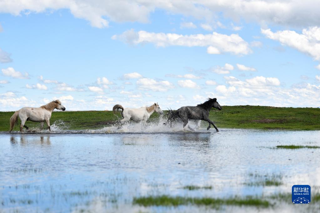 河曲馬在甘肅省甘南藏族自治州瑪曲縣河曲馬場(chǎng)的濕地奔跑(2019年6月22日攝)。新華社記者 陳斌 攝