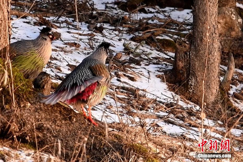 高原初冬,在位于祁連山國家公園青海片區(qū)的海北州門源縣,寺溝管護(hù)站管護(hù)員在日常巡護(hù)途中,拍攝到幾只國家二級(jí)保護(hù)動(dòng)物血雉在林間悠閑覓食的珍貴影像。血雉是高寒山地森林及灌叢雉類,棲息于雪線附近的高山針葉林、混交林及杜鵑灌叢中,海拔高度多在1700-3000米,主要分布于中國,系中國特有物種。血雉素有高原“顏值擔(dān)當(dāng)”物種之稱,血雉外形似眼戴太陽鏡、腳著紅色小靴,行進(jìn)跳躍間時(shí)不時(shí)以喙梳理“漸變色”羽毛。活動(dòng)時(shí)常有雄鳥擔(dān)任警衛(wèi),遇危險(xiǎn)時(shí)擔(dān)任警衛(wèi)的雄鳥常發(fā)出急促的“si”聲,其余個(gè)體聞聲后立刻鉆入林下草叢或灌叢中隱蔽。圖為血雉梳理羽毛。王國忠 攝