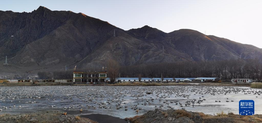 拉薩市林周縣邊交林鄉(xiāng)的池塘里,大量斑頭雁、赤麻鴨等候鳥棲息(12月24日攝,手機照片)。新華社記者 沈虹冰 攝