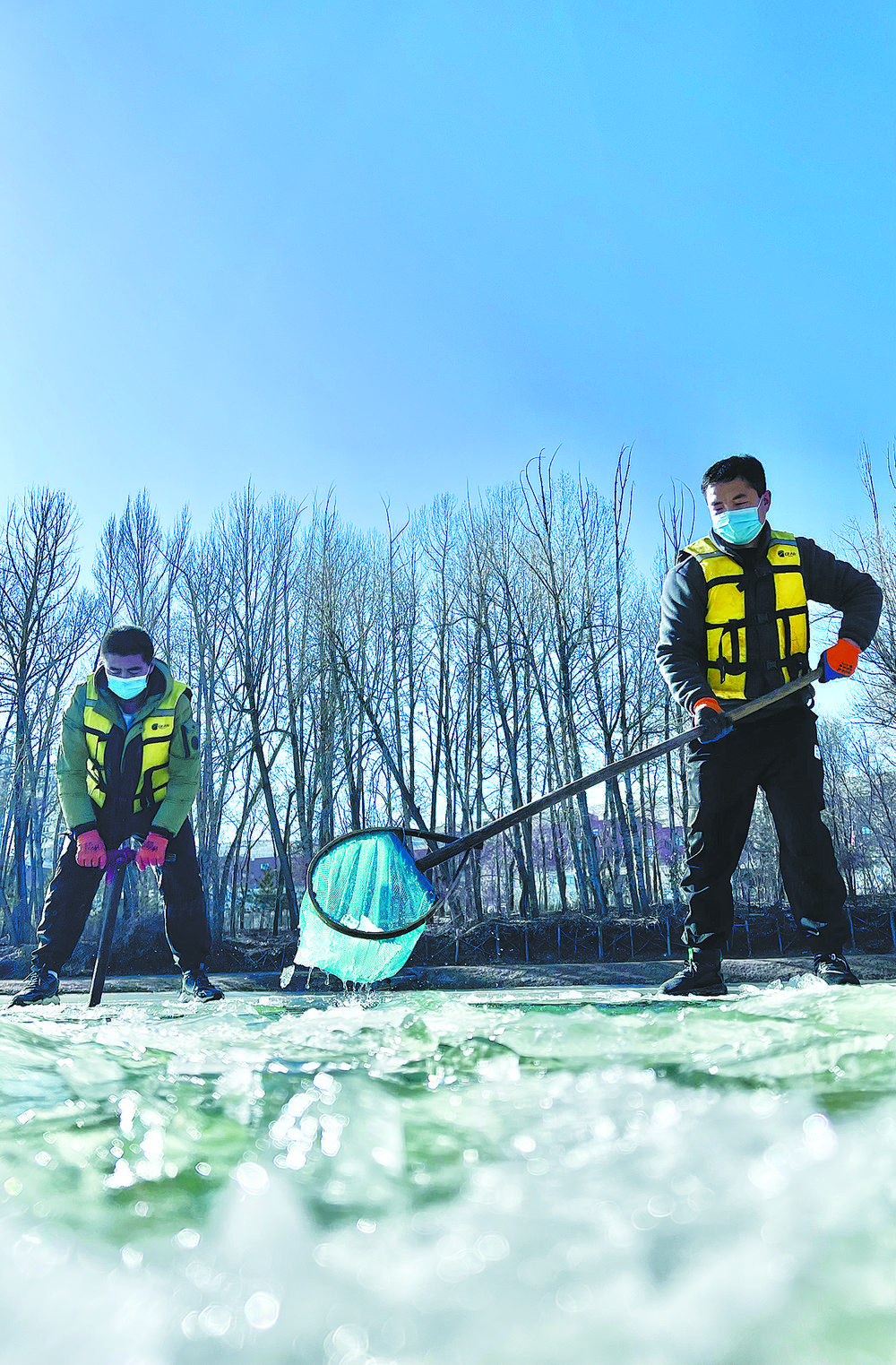 陽光透過冰面照射在18口冰封的魚塘里,為過冬的小魚苗增氧增溫。這片池塘是裸鯉來到裸鯉救護中心的第一站,田文根是這里的一名工作人員,主要負責室外原種場魚苗的培育和水質(zhì)監(jiān)測工作。據(jù)他介紹,魚塘的水質(zhì)決定著魚苗的健康狀況。在冬季,及時掃雪是一項非常重要的工作,因為冰層下面的裸鯉魚苗是靠浮游植物通過光合作用產(chǎn)生的氧氣生存,如果雪附著在冰層上,陽光無法透進,就容易造成缺氧。