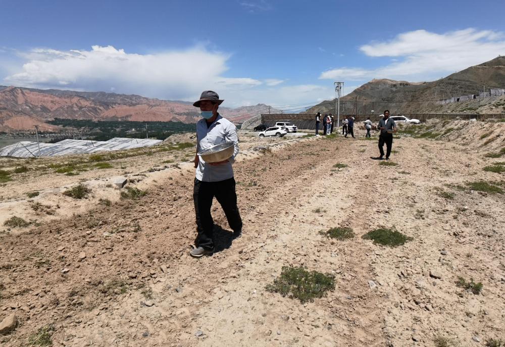撂荒地上撒綠肥種子。記者 潘玲 攝