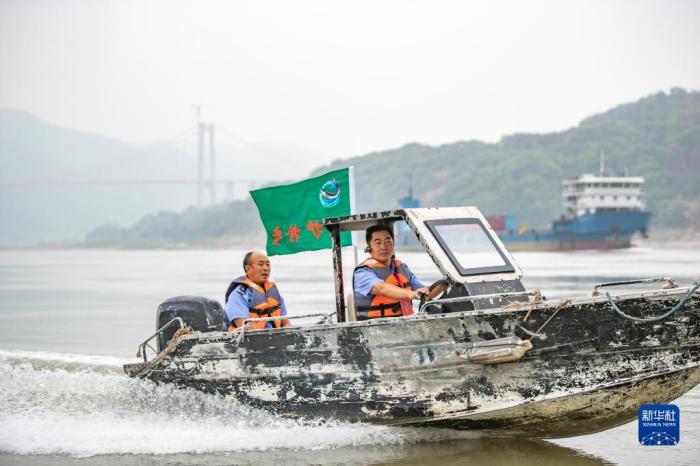 鴻鵠護(hù)魚志愿隊(duì)隊(duì)長劉鴻(右)帶領(lǐng)隊(duì)員在長江重慶江津段巡護(hù)(2022年9月2日攝)。新華社記者 黃偉 攝