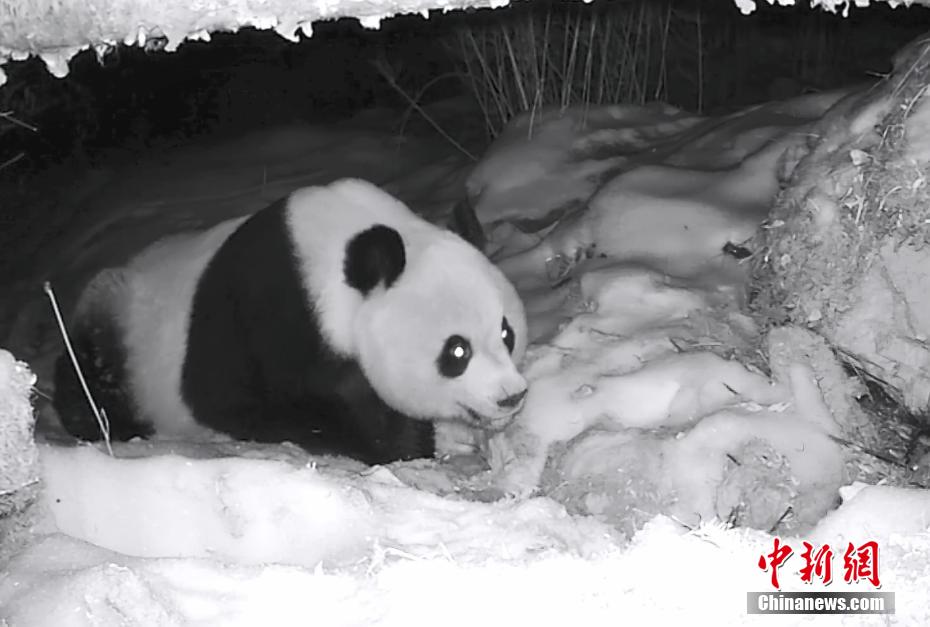 近日,大熊貓國家公園四川平武王朗片區(qū)工作人員在回收野外紅外線相機(jī)時,發(fā)現(xiàn)幾段野生大熊貓在雪地中找水喝的珍貴影像。圖為野生大熊貓在雪地中找水喝。