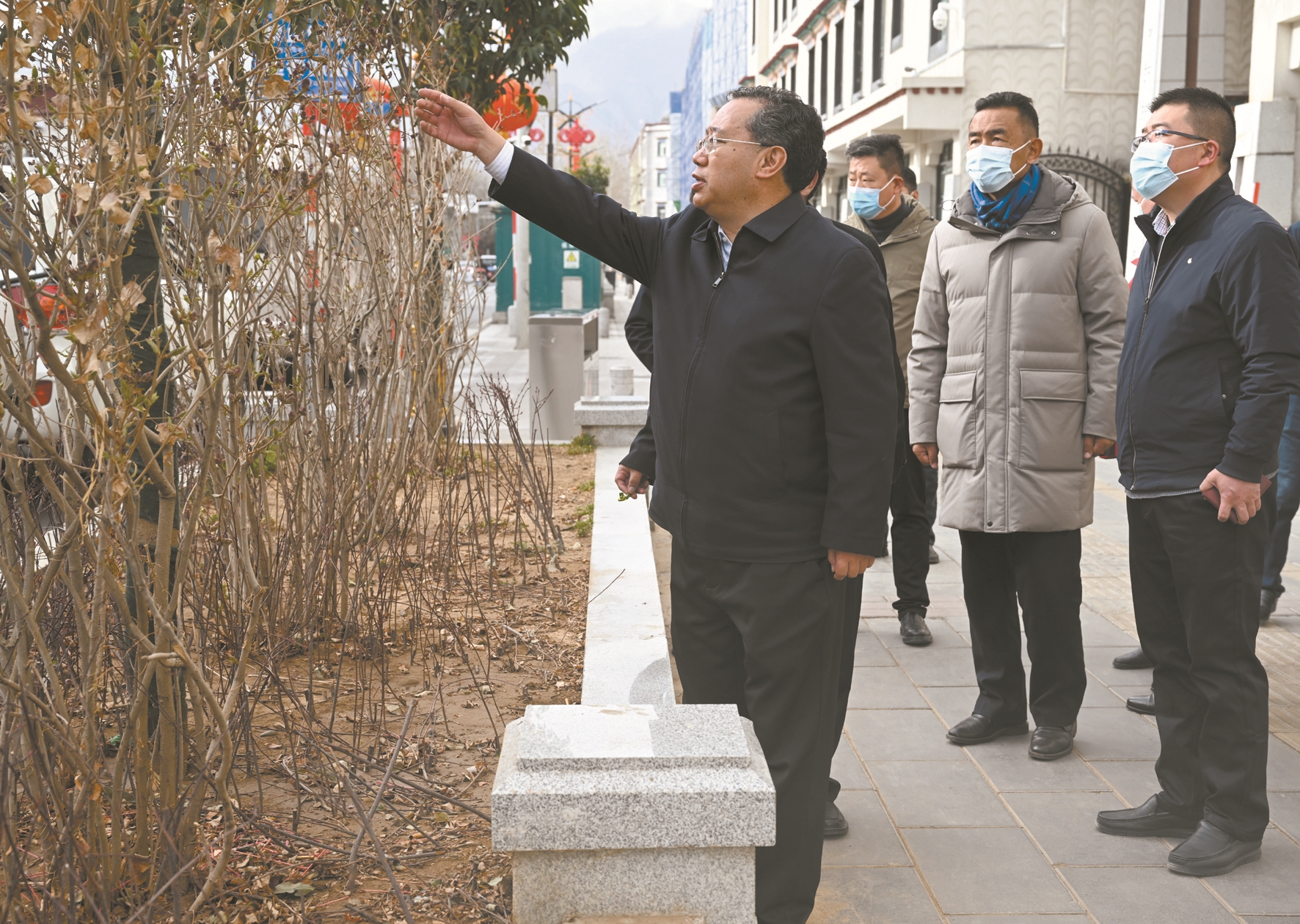 3月15日,西藏自治區(qū)黨委常委、市委書(shū)記普布頓珠帶隊(duì)深入城關(guān)區(qū),調(diào)研城市建設(shè)管理工作。圖為普布頓珠在朵森格路中段調(diào)研道路兩旁綠化帶植物缺損問(wèn)題。拉薩融媒記者 巴桑次仁攝