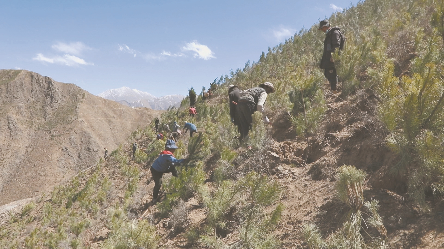 駝鈴叮當(dāng),跟著馱著樹苗的馬隊爬山一個多小時,記者來到了拉薩南北山綠化工程項目南山公園一號片區(qū)的后山,爬上山頂,與布達(dá)拉宮遙遙相望,拉薩市區(qū)的景色盡收眼底。在這里,幾十名群眾正在栽種馬隊馱上來的樹苗,在挖好的坑里回填泥土,將樹苗放進(jìn)去,扶正填土,再踩實覆土,大家有的種樹,有的澆水,步驟熟練、配合默契。在他們的努力下,原本光禿、山石裸露的山體已經(jīng)披上了綠裝。來自曲水縣的尼瑪是南山公園的護(hù)林員,拉薩南北山綠化工程項目實施后,他加入了其中,在南山公園一號片區(qū)種樹護(hù)苗。