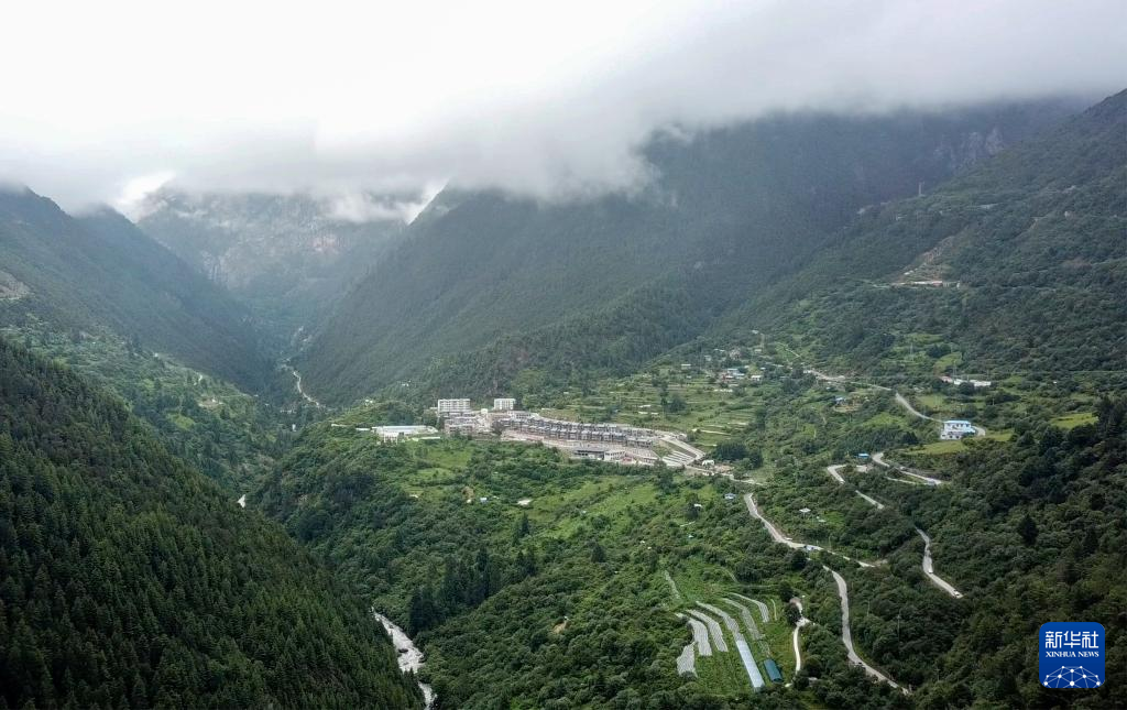 這是錯那市貢日門巴民族鄉(xiāng)斯木村,畫面下方覆蓋地膜處為該村的莓茶種植基地。(無人機(jī)照片,7月28日攝)。新華社記者 旦增尼瑪曲珠 攝