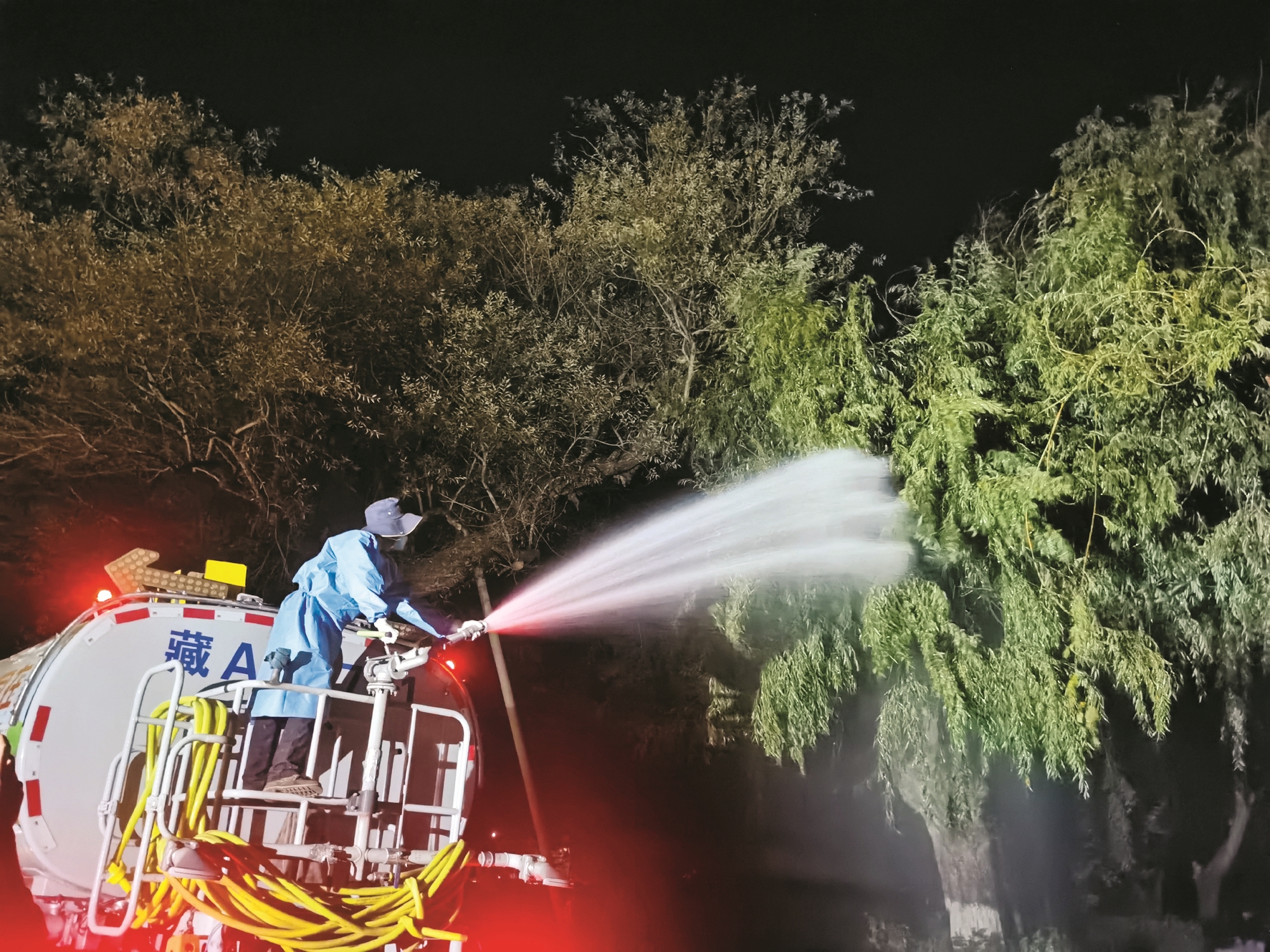 隨著夜幕降臨,羅布林卡公園內(nèi)市民游客逐漸散去,城關(guān)園林養(yǎng)護(hù)工人駕駛灑藥車開始入場,準(zhǔn)備為園區(qū)內(nèi)的苗木進(jìn)行噴藥殺蟲作業(yè)。雨季過后,拉薩氣候較為干爽,為蟲害滋生提供了溫床,城關(guān)園林養(yǎng)護(hù)人員在前期排查發(fā)現(xiàn),羅布林卡公園廣場的苗木上有不同程度的柳葉蜂、柳大蚜蟲害現(xiàn)象。經(jīng)過技術(shù)人員的“把脈問診”,確定害蟲種類、生長階段后,城關(guān)園林當(dāng)天組織兩輛大型灑藥車對園區(qū)進(jìn)行集中作業(yè),以預(yù)防大范圍的蟲害以及幼蟲化蛹越冬。