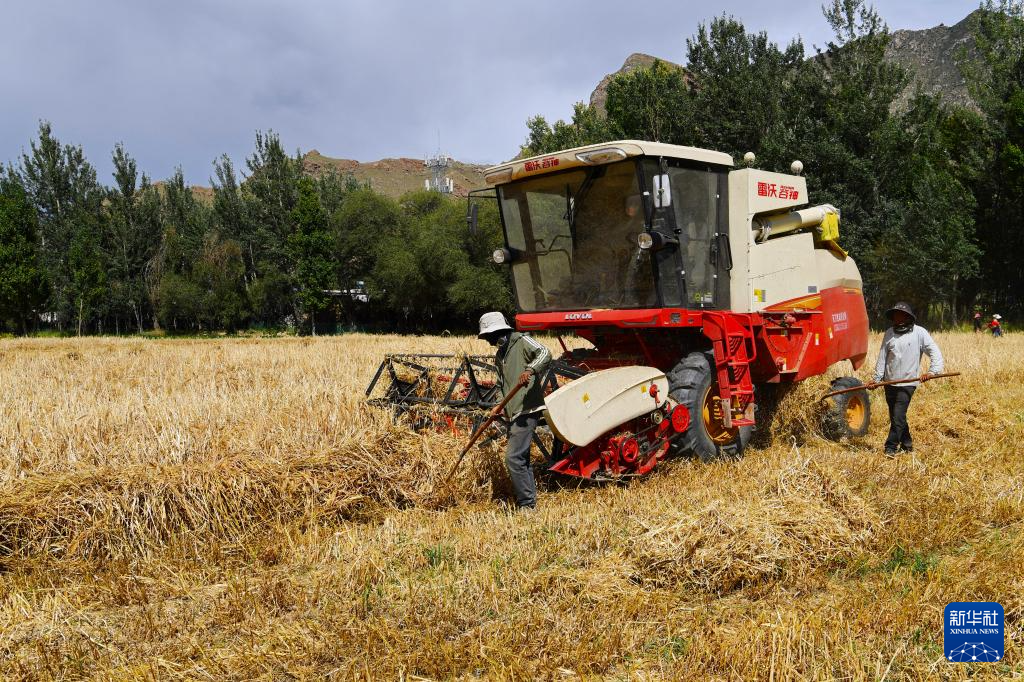 工作人員駕駛農(nóng)業(yè)機械在西藏拉薩市林周縣曲果強村的高標準農(nóng)田里收獲小麥(10月12日攝)。新華社記者 張汝鋒 攝