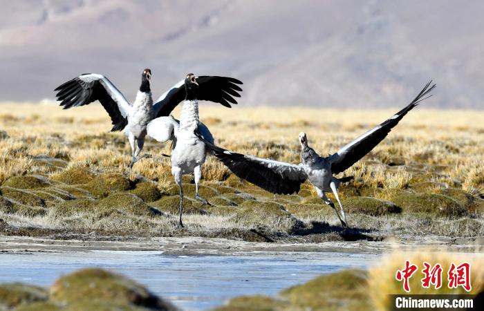 10月21日,黑頸鶴在西藏那曲市申扎縣買巴鄉(xiāng)附近的濕地“翩翩起舞”?!±盍?攝