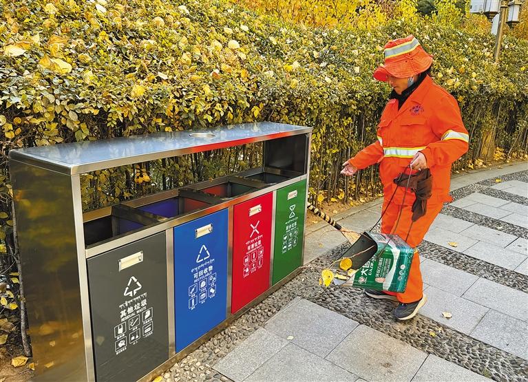 圖為環(huán)衛(wèi)工人在按照分類(lèi)投放垃圾。記者 王敏 攝