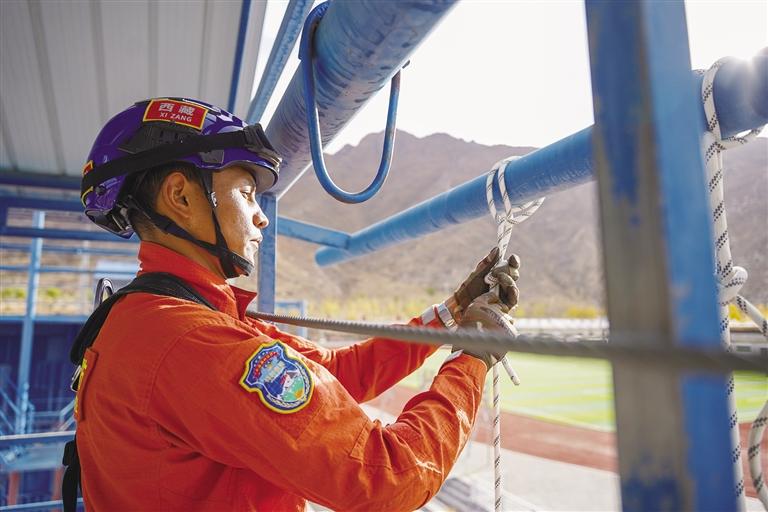 迅速打好繩結、扣好安全帶……27歲的仁增論珠身著全套戰(zhàn)訓服,正在進行繩索下降訓練。身姿矯健、動作干凈利落,眨眼間,他已安全降至地面。仁增論珠從小就有個當兵夢,2015年,他應征入伍,三年部隊生活錘煉了他的體能和意志。2019年,仁增論珠入職自治區(qū)森林消防總隊,成為一名消防戰(zhàn)士,繼續(xù)為保家衛(wèi)國貢獻自己的力量。