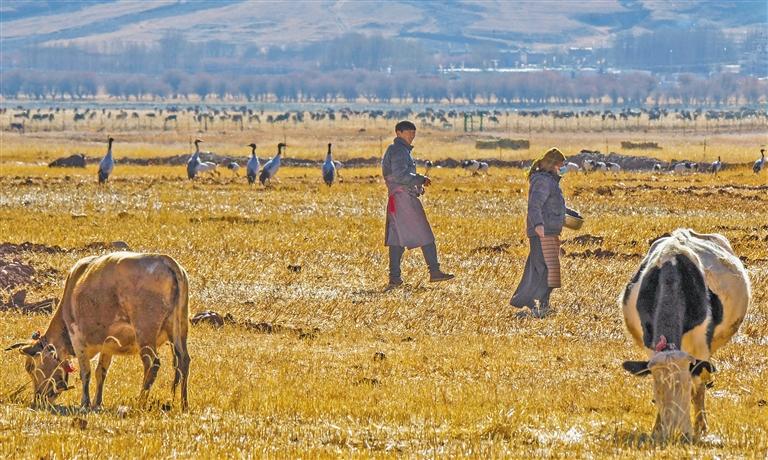 卡孜濕地是其中一個投食點?,F(xiàn)年43歲的洛桑次旦就住在附近,每天一大早,他都會到卡孜濕地放牧。“‘鄰居’越來越多了,十幾年的時間,黑頸鶴的數(shù)量從幾只增長到幾百只?!甭迳4蔚└嬖V記者,黑頸鶴和牛各吃各的,互不干擾,非常和諧。