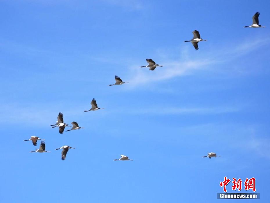 西藏林芝巴松措景區(qū)迎“高原精靈”黑頸鶴越冬