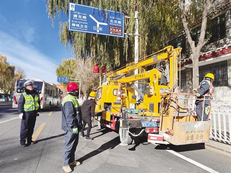 園林工人修剪遮擋路燈、監(jiān)控探頭的枝葉。圖由拉薩城關(guān)區(qū)潔達(dá)園林綠化投資工程有限公司提供