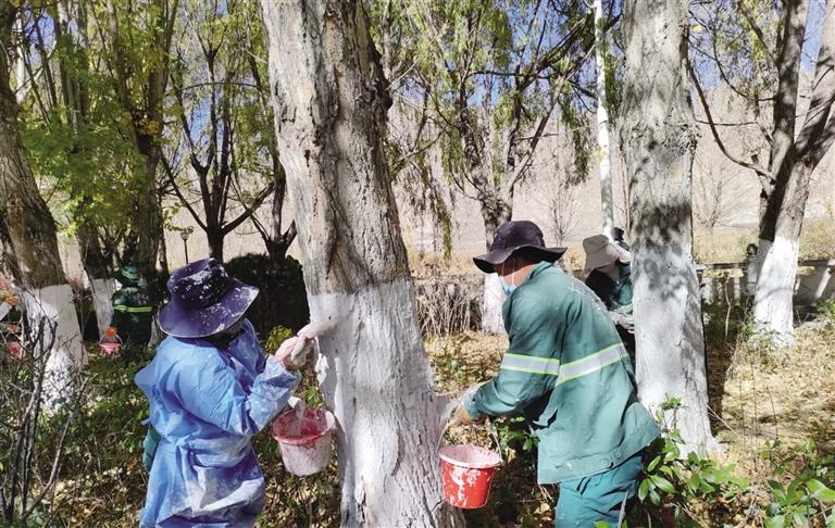 園林工人為樹(shù)木涂白防蛀蟲(chóng)。 圖由拉薩城關(guān)區(qū)潔達(dá)園林綠化投資工程有限公司提供