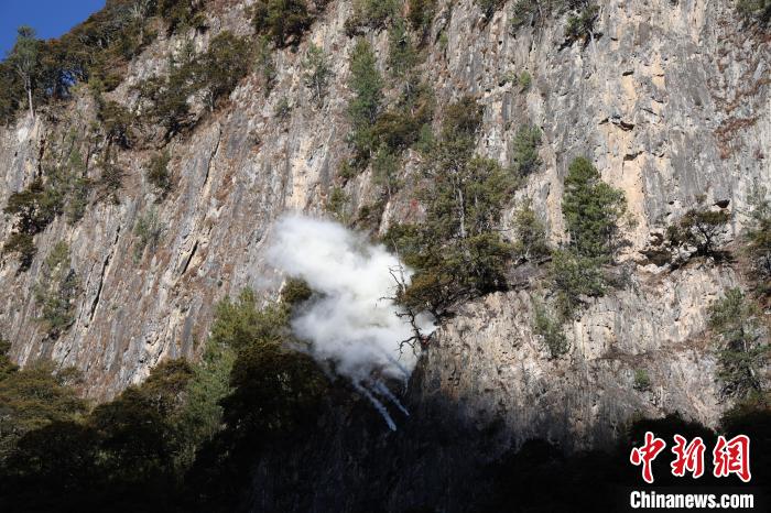圖為演練現(xiàn)場,無人機(jī)投彈撲打懸崖火。王澤棟 攝