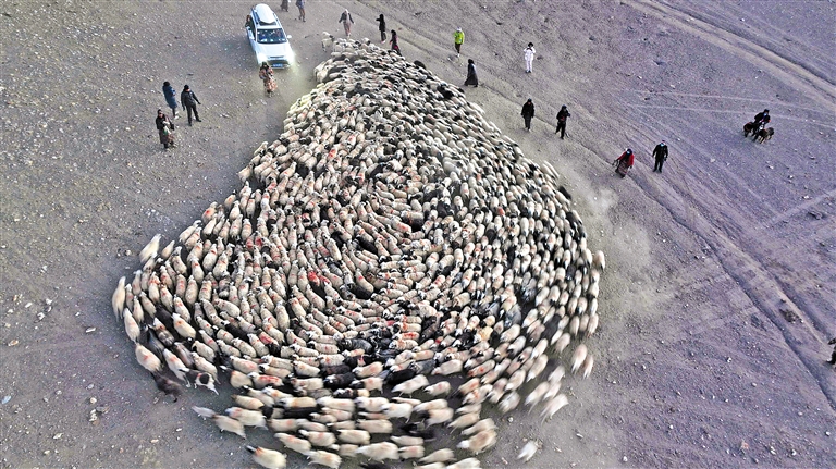 推瓦村牧民將羊群聚攏,準備轉場。記者 阿旺尼瑪 攝