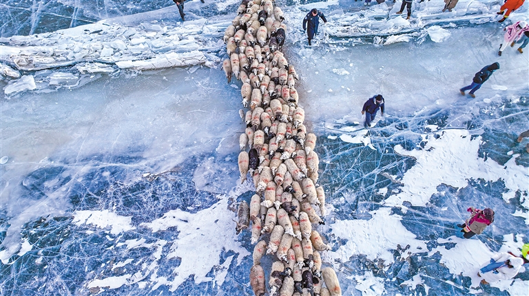 引路的牧羊人抱著羊羔走在前面,吸引著頭羊上冰。其他牧羊人驅趕著羊群跟在后面,幾只牧羊犬護衛(wèi)著羊群。