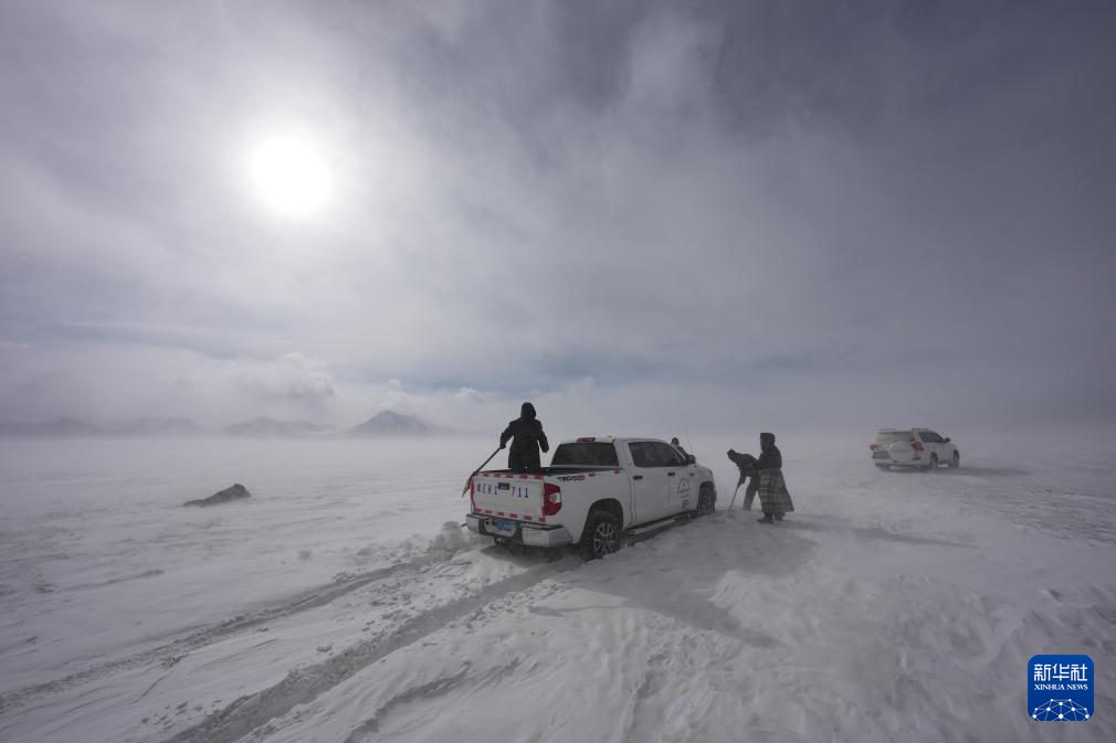 瑪曲鄉(xiāng)長江源黨員環(huán)保志愿隊巡邏途中車輛陷入雪中后進行自救(2024年2月2日攝)。新華社記者 晉美多吉 攝