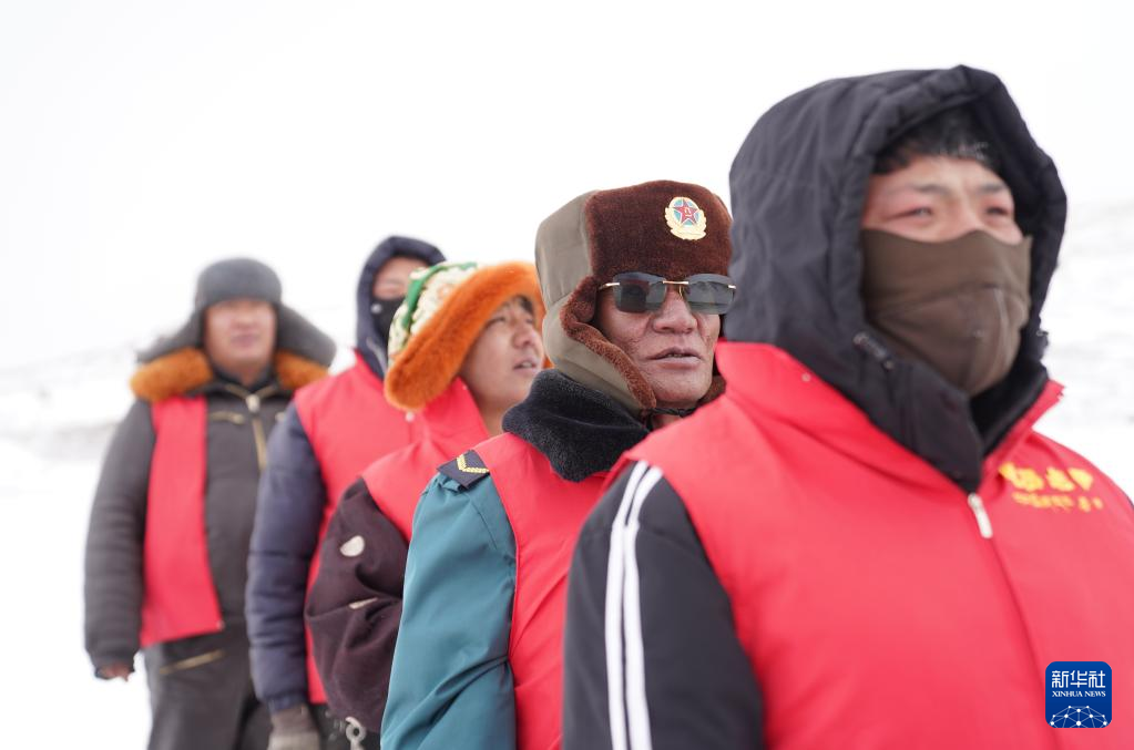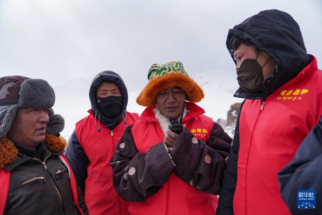 瑪曲鄉(xiāng)長江源黨員環(huán)保志愿隊年近七旬的才嘎老人(右二)在巡邏守護長江源(2024年2月2日攝)。新華社記者 晉美多吉 攝