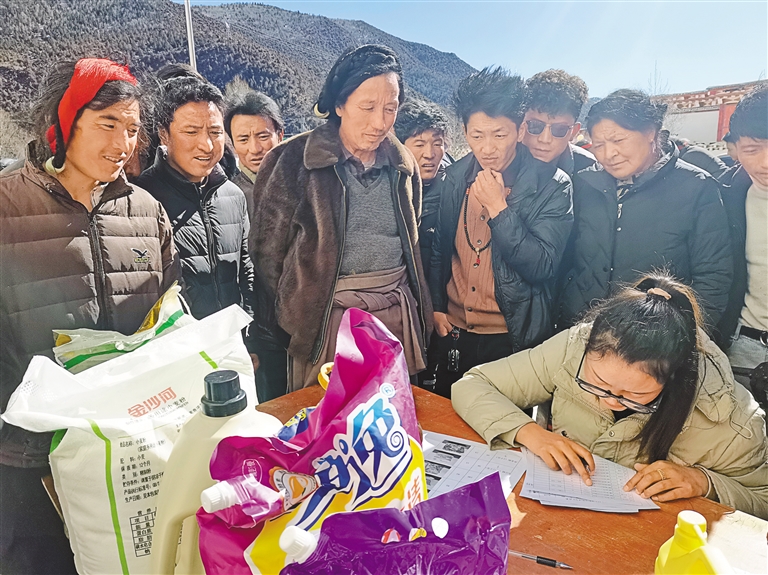 圖為芒康縣幫達(dá)鄉(xiāng)毛尼村群眾用積分兌換生活物資現(xiàn)場。記者 周婷婷 攝